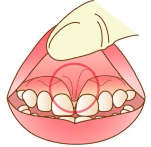 上唇小帯は上唇と歯茎を繋ぐ、上前歯の中央にある筋です。上唇小帯が短いと上顎の成長を抑制し、歯並びに悪影響を及ぼす場合があります。上の前歯に隙間ができることもありますが、隙間に汚れが溜まりやすいと虫歯にもなりやすくなります。歯磨きの時に小帯を傷付けてしまうこともあります。