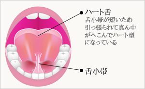 舌小帯は舌の裏にある下顎と舌を繋ぐ筋です。この筋が短いことを舌小帯短縮症と呼びます。重度の場合、咀嚼や嚥下、発音障害の原因にもなり、哺乳が上手く出来なかったり、話しづらさを感じたり、硬いものが上手く食べられないといったこともあります。このような場合は治療をする事によって改善が見込まれます。
