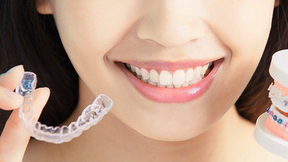透明のマウスピース型矯正装置は