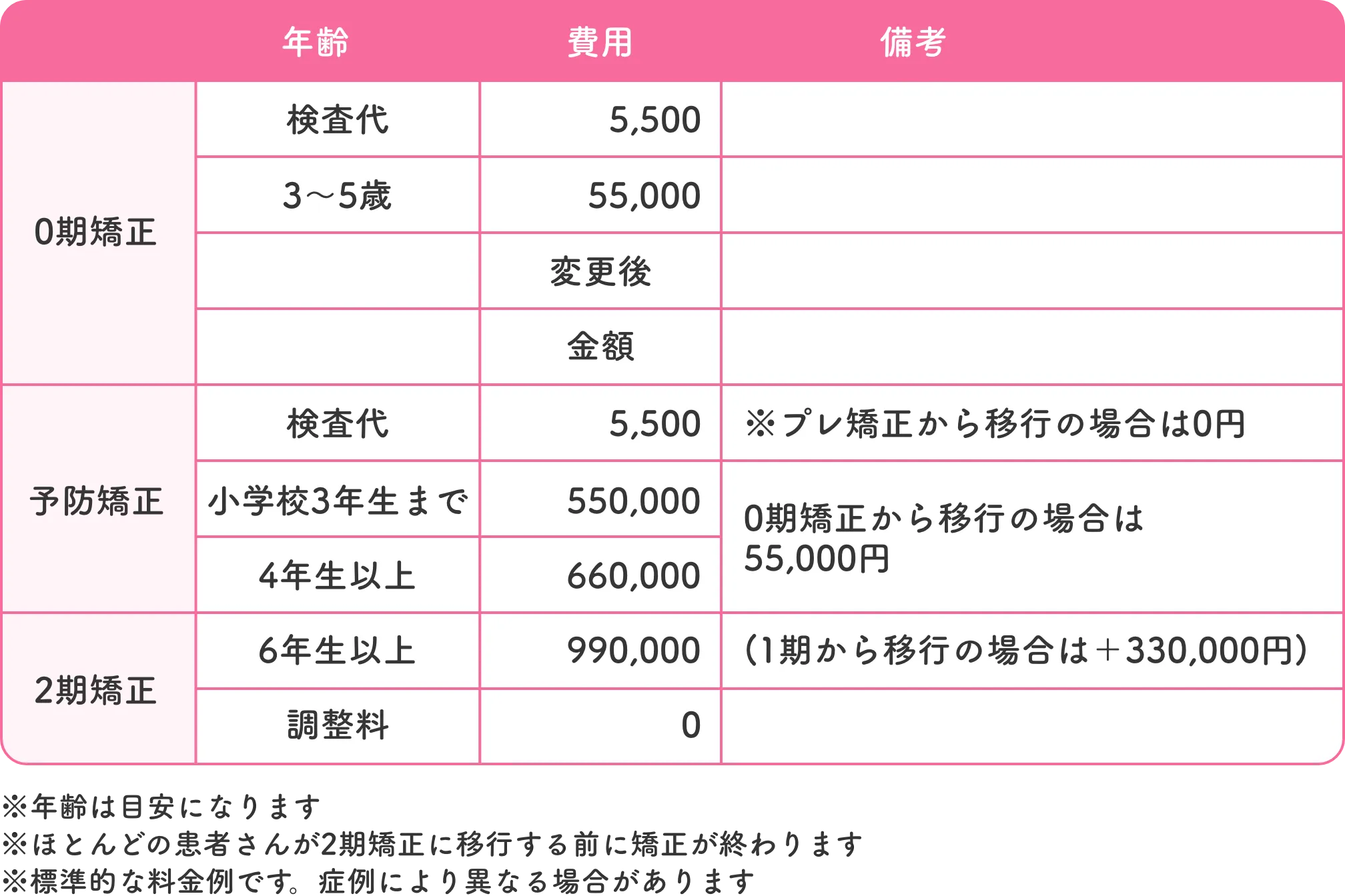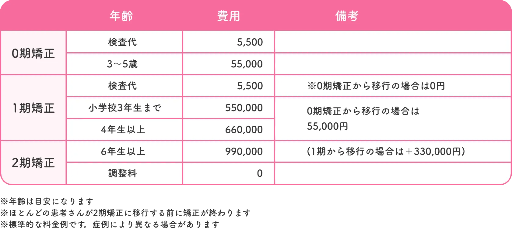 矯正の開始時期によって異なります。矯正相談の際におおよその治療費用の目安や支払方法について詳しくご説明させていただきます。また当院では分割でのお支払いも可能なので、お気軽にご相談ください。